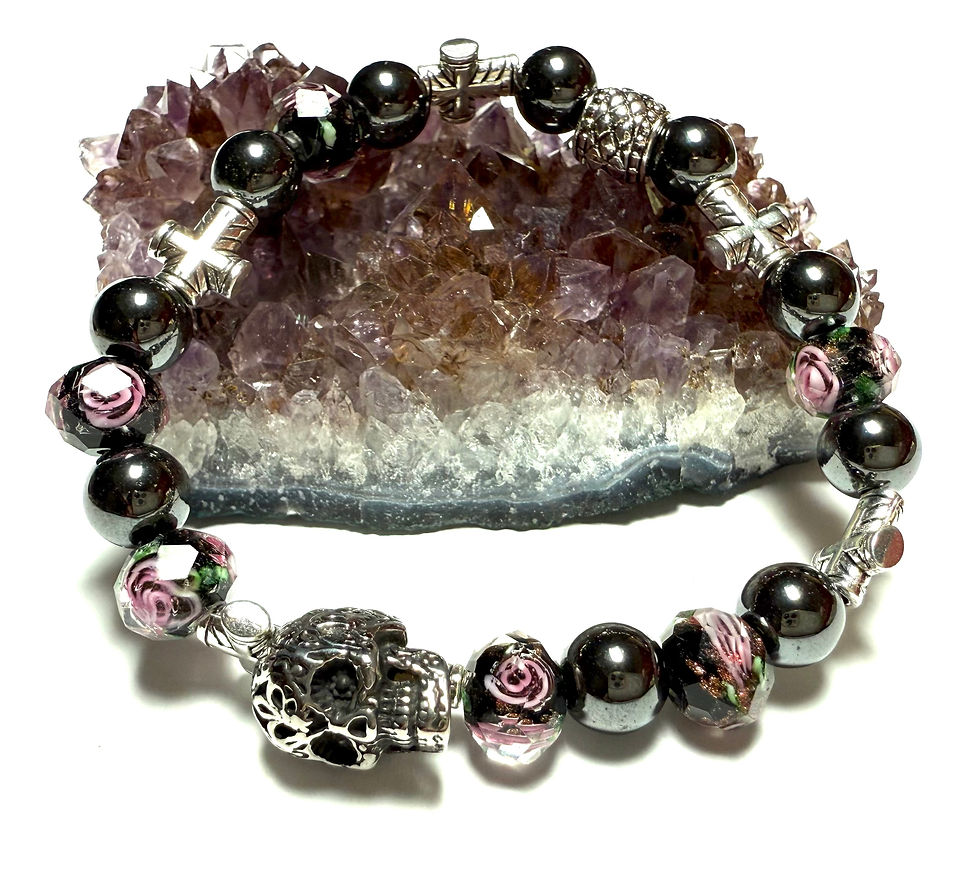 Hematite, Floral Beads & Stainless Steel Skull Bracelet